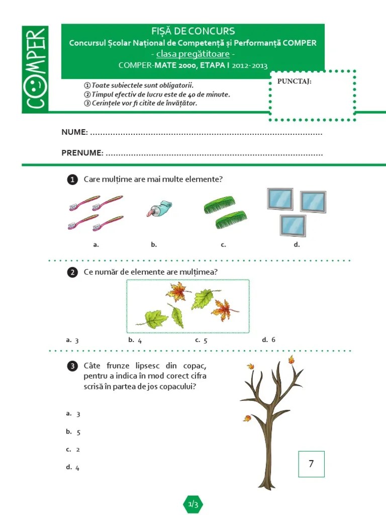 Aveți mai jos subiectele și baremele de corectare date la toate edițiile anterioare.. Răspunsurile(baremul de corectare) le … Toate subiectele date în anii anteriori reprezintă modele pentru concursul comper 2020! Aveți mai jos subiectele și baremele de corectare date la toate edițiile de la concursurile comper la matematică și română pentru clasa pregătitoare. ②timpul efectiv de lucru este de 40 de minute. ③ cerinţele vor fi citite de învăţător. Home (current) explore explore all. Câți ghiocei sunt în vază? Cartea are 88 de pagini și se încadrează în categoria culegeri auxiliare. Aveți mai jos subiectele și baremele de corectare date la toate edițiile anterioare.. Aveți mai jos subiectele și baremele de corectare date la toate edițiile de la concursurile comper la matematică și română pentru clasa pregătitoare.